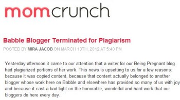 According to Babble, the plagiarist copied work from a fellow Babble blogger’s work for another site. After learning of the charges, Babble wrote that it “investigated the accusation, found it to be accurate, and immediately dismantled the posts from the blogger in question.”