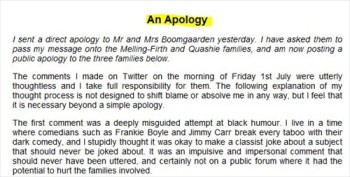 The freelancer, Kia Abdullah, called her comments “a profoundly misguided attempt at black humour” and commented that she “deeply regrets” them. She has also issued a public apology and a private apology to the family members.