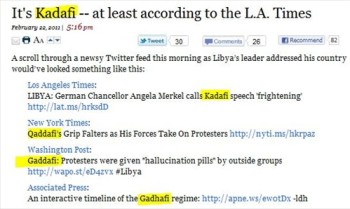 The Los Angeles Times’ readers’ representative, Deidre Edgar, explained in a recent blog post why the Los Angeles Times, the New York Times, the Washington Post and Associated Press all spell the name of Libya’s leader differently.