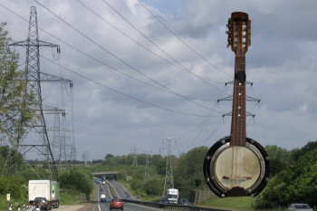 A huge banjo sculpture will not be looming over the A47 Southern Bypass in Norwich, UK. (Photo Illustration by London Shearer Allen; Credits: Graham Hardy via Geograph and Arent via Wikipedia)