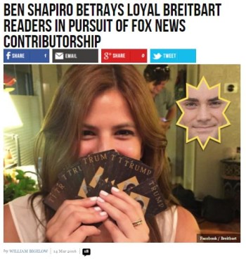 The article was headlined, “Ben Shapiro Betrays Loyal Breitbart Readers in Pursuit of Fox News Contributorship.”