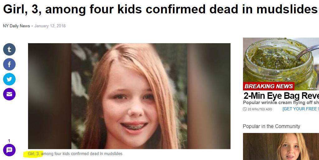 “Girl, 3, among four kids confirmed dead in mudslides” is the caption to a picture of an adolescent girl in braces. Internet news fails once again. No wonder “alternative facts” are eroding trust in the news and blurring the line between truth and propaganda.”