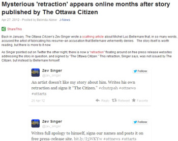 Both Bellemare and the Ottawa Citzen denied writing the retraction, which was published on Free-Press-Release.com, according to J-Source, but the Citizen’s Singer tweeted about the fabricated retraction writing April 25 “An artist doesn’t like my story about him. Writes his own retraction and signs it ‘The Citizen.'” Singer also tweeted that Bellemare “writes full apology to himself, signs our names and posts it on free press-release site.” J-Source noted that Singer said he didn’t have any evidence that Bellemare wrote the retraction, but that he argued “the retraction has Bellemare’s fingerprints all over it” based on “having read dozens of his creations, and no small number of pages of his unique prose stylings.”