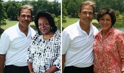 On the left, see Dorothy Davidson's doctored campaign photo, which Photoshopped Davidson into the original photo on the right, of Alabama football coach Nick Saban and his wife found on his charity's web site. (Credit: Birmingham News, Nick's Kids)