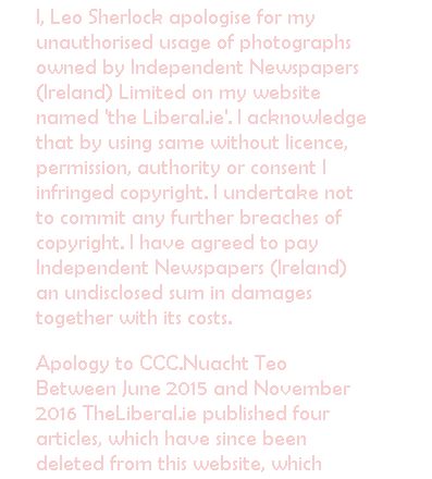 “Between June 2015 and November 2016 TheLiberal.ie published four articles, which have since been deleted from this website, which reproduced or adapted articles by CCC.Nuacht, a leading Irish court news agency whose stories appear in Irish media outlets. I on behalf of TheLiberal.ie acknowledge that these articles were published without obtaining a licence to do so and that they thereby infringed the copyright of CCC.Nuacht.