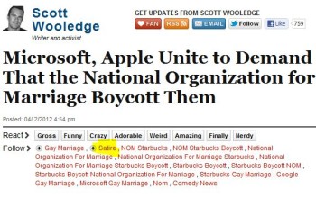 Fox Nation reported that the story originated from a Daily Kos “satirical post” that the Huffington Post’s comedy section picked up. See the satirical article “Microsoft, Apple Unite to Demand That the National Organization for Marriage Boycott Them” here.