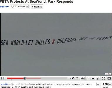 PETA PUBLICITY STUNTS: In early March, PETA protested SeaWorld's mistreatment of whales and dolphins by flying the above banner over the park. (Credit: Orlando TV station WESH)