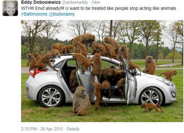 His tweet showed a picture of a car with monkeys climbing all over and inside of it. The caption he wrote stated: “WTH!! Enuf already!!! U want to be treated like people stop acting like animals #Baltimorons @budsnanny.” Ad Week’s TV Spy posted a screenshot of the tweet.