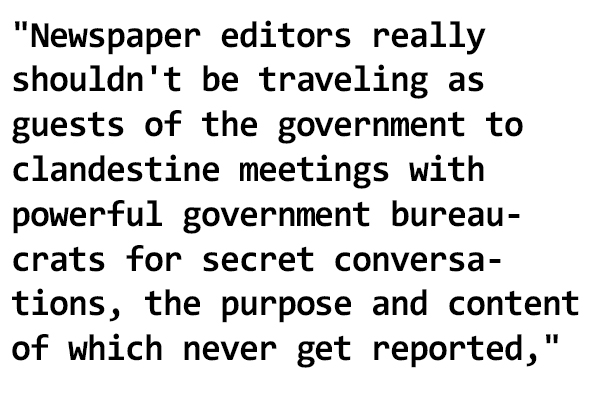 “Newspaper editors really shouldn’t be traveling as guests of the government to clandestine meetings with powerful government bureaucrats for secret conversations, the purpose and content of which never get reported,” Canadian news site Canadaland reported.