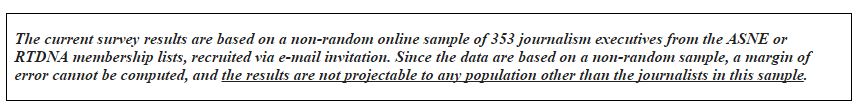 It has been crystal clear from the day this research was released that the news executives on the lists were invited by email to participate and that the interviews were conducted online. That does indeed mean that news executives without email were not included. It also means that news executives without internet access were not included. And that does means that members of the ASNE and RTDNA who did not provide email addresses or who do not have internet access were not included. [emphasis added]