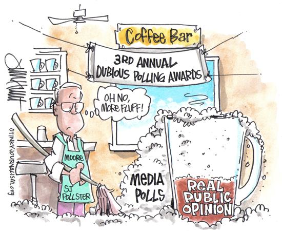 With this article, veteran pollster, author and political scientist, David W. Moore, issues the Third Annual Top Ten “Dubious Polling” Awards. These awards are intended to mark for posterity some of the most risible and otherwise outrageous activities by polling organizations during the previous year. This year, the awards are presented in reverse numerical order, from Number 10 to Number 1, with Number 1 being the “most” dubious.