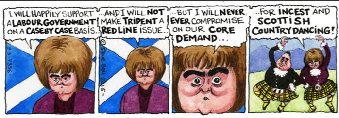 The March 9 cartoon strip by Steve Bell showed two Scottish politicians, Nicola Sturgeon and Alex Salmond, with Sturgeon saying she would “happily support a Labour goverment…but I will never ever compromise on our core demand…for incest and Scottish country dancing!” The pair are shown dancing in kilts in the last panel of the cartoon.