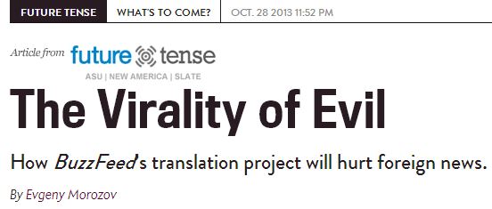 The Slate article, by Evgeny Morozov, is titled: “The Virality of Evil: How BuzzFeed’s translation project will hurt foreign news.’