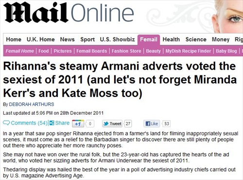 The Hindustan Times wrote in a Dec. 29 article about Rihanna that “Rihanna’s scorching hot advertisement for Armani Underwear has been voted as the sexiest of 2011. The raunchy promo was hailed the best of the year in a poll of advertising industry chiefs carried out by US magazine Advertising Age.”
