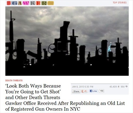 Gawker noted in a Jan. 8 post that within 75 minutes of its publishing a “446-page list of every licensed gun owner in New York City” created from “the NYPD … via a Freedom of Information Law request,” it also started receiving threats. According to Gawker, its list only included “names, not addresses” and that it was all “information that was already publicly available.”