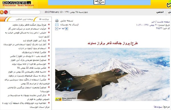 Did Iranian news site Khouz News publish a Photoshopped picture of a fighter jet above snow-covered mountains?