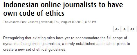 The Online Journalist Association is creating a “code of ethics for online journalists” this year, the Jakarta Post reported. The association is a group of “journalists from mainstream online media outlets.”
