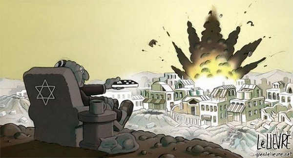 The cartoon by Glen Le Lievre depicted “an elderly man, with a large nose, sitting alone, with a remote control device in his hand, overseeing explosions in Gaza,” according to the newspaper. His armchair had a Star of David on it, “and the man was wearing a kippah, a religious skullcap.”