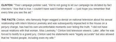 As the Huffington Post explained, “The AP’s fact-check…suggests that because Clinton lied in the late 1990s, he isn’t justified in calling out another politician or campaign for producing an ad that’s untrue.”