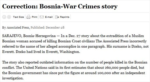 According to the correction, the AP included “outdated” statistics for the ” number of people killed in the Bosnian conflict.’ No small difference, though: According to the correction, “an independent investigation” the Bosnian government cites claims that about 100,000 people were killed. The AP apparently used the United Nations’ claim that 260,000 people were killed.