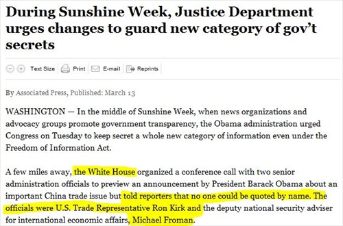 The Associated Press explained in its article, “During Sunshine Week, Justice Department urges changes to guard new category of gov’t secrets,” that “the White House organized a conference call with two senior administration officials to preview an announcement by President Barack Obama about an important China trade issue but told reporters that no one could be quoted by name.” The Associated Press did not attribute any quotes to Kirk or Froman, but did name the pair.