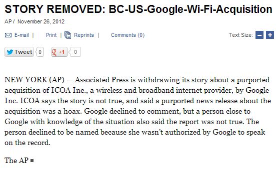 The kill notice reads, according to a posting on Philly.com, that the AP was “withdrawing its story about a purported acquisition of ICOA” because the company “says the story is not true” but based on a “hoax” press release. In addition, the kill notices notes an anonymous “person close to Google” denied the claims.