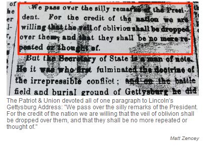 “This infamous ‘review,’ which seems to imply the newspaper ignored the Gettysburg Address altogether, is also trotted out on occasion as evidence of how newspaper people sometimes miss history being made right in front of their notebooks.”