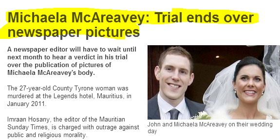 Michaela McAreavey, a schoolteacher from Ireland, was murdered while on her honeymoon in Mauritius with her husband John in 2011. And making matters worse for her husband, The Sunday Times, a newspaper in Mauritius, published 12 graphic crime scene photographs of her dead, bikini-clad body.
