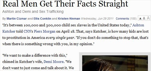 The Village Voice published a lengthy article arguing Kutcher’s April 2011 claims on CNN that there are “between 100,000 and 300,000 child sex slaves in the United States today” is inaccurate. According to the Voice, that statistic has been used in Congress and news outlets like the New York Times, USA Today, and Salon. The Voice cited “Law enforcement records” which indicate 827 arrests a year for child prostitution in the U.S.