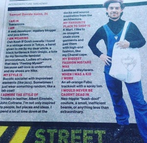“My friend Tara runs the ‘Street Seen’ column [in The Age] and asked me if I wanted to do it. The decision to do it in character was impulsive. I think the impulse to do it in character initially came from wanting to avoid the embarrassment of doing the column sincerely.”