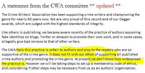 Gawker added that the Crime Writers Association weighed in on the self-reviews, which it called “misleading” and “unfair.” That statement, published on the association’s website, notes that the association is “taking steps to set up a membership code of ethics, and considering if other steps may be necessary from us as an authors’ organisation.”