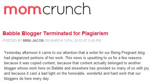 According to Babble, the plagiarist copied work from a fellow Babble blogger’s work for another site. After learning of the charges, Babble wrote that it “investigated the accusation, found it to be accurate, and immediately dismantled the posts from the blogger in question.”
