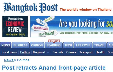 “The Bangkok Post would like to clarify that both the headline and statements attributed to former prime minister Anand Panyarachun in the article are erroneous and totally groundless.