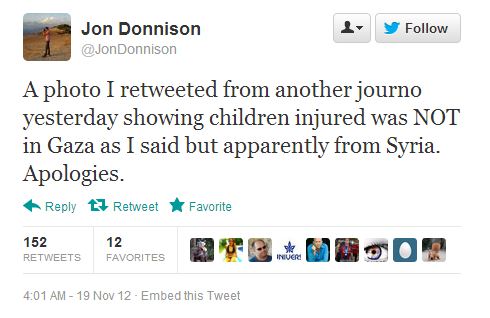 “A photo I retweeted from another journo yesterday showing children injured was NOT in Gaza as I said but apparently from Syria. Apologies.”