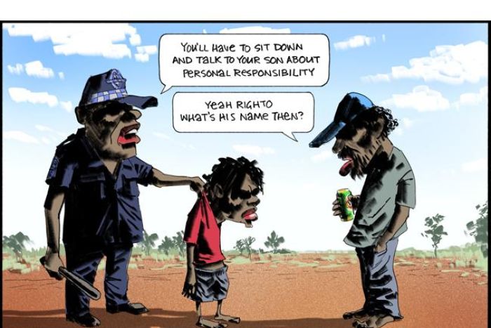 Readers are upset over a cartoon in daily newspaper The Australian about indigenous people. The cartoon by Bill Leak pictures a policeman telling a man to “talk to your son about personal responsibility” and the man, holding a can, saying “yeah righto what’s his name then?”