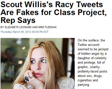 The tweets were as attention-getting as they were “full of graphic, snarky, profanity-laced posts about sex, drugs, cigarettes and partying,” according to People magazine. But according to People, “a rep speaking on behalf of Scout” Willis explained that the tweets were “all fakes created by Scout and two other students to test a theory” for a class assignment.