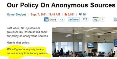 Business Insider defended its broad policy by claiming that sources will provide more information in interviews if the site offers an easy promise of anonymity.