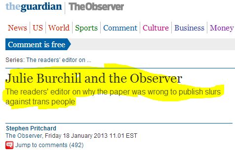 As iMediaEthics has written, in a January column, the Observer’s Julie Burchill called transgender people “bed-wetters in bad wigs,” “dicks in chicks’ clothing,” and so on. Burchill’s column was in response to criticism of her friend Suzanne Moore’s writings on “women’s anger.”