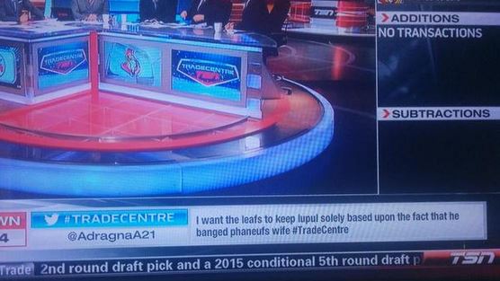 The person who tweeted the comment, @AdragnaA21, wrote it was “my bad” because Lupul didn’t like the tweet, but “TSN failed to their job right” (sic). He added that his comment was a “joke” and he was surprised TSN aired the tweet.