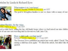 After a month-long suspension from writing because of plagiarism, Linda and Richard Eyre's column for the Deseret News was re-instated...