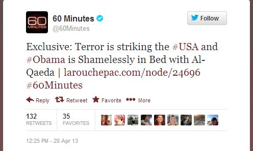 The fake tweet read, pictured above, “Exclusive: Terror is striking the #USA and #Obama is Shamelessly in Bed with Al-Qaeda,” along with a link to LaRouchePac.com. That is the website for Lyndon LaRouche’s political action committee, which says it is “what stands between you and an otherwise inevitable collapse of civilization.”