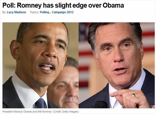 Having just prompted respondents to think about the economy, the poll found that “Romney has a slight edge over Obama” – a 3-point lead. I wonder what their results would have been had they asked the economy questions later in the survey.