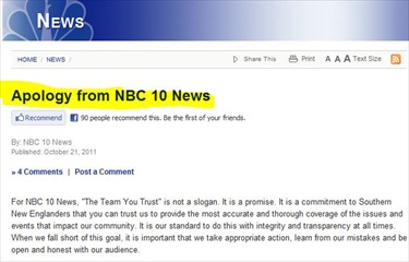 “On the evening of October 10, 2011, NBC 10 News posted a story on www.turnto10.com about the Providence Community Action Program’s Wheels for Meals program. The next morning, we noticed that the article was nearly identical to a story posted on the Providence Journal’s online blog the week before. We immediately removed the story from our web site and began an inquiry. We have concluded our investigation and taken appropriate action.”