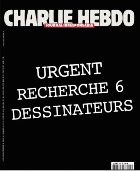 The image claimed the magazine was hiring six new cartoonists. It read: “Urgent Recherche 6 Dessinateurs” (Urgent, searching for six cartoonists). Twelve people were killed in the Jan. 7 attack.