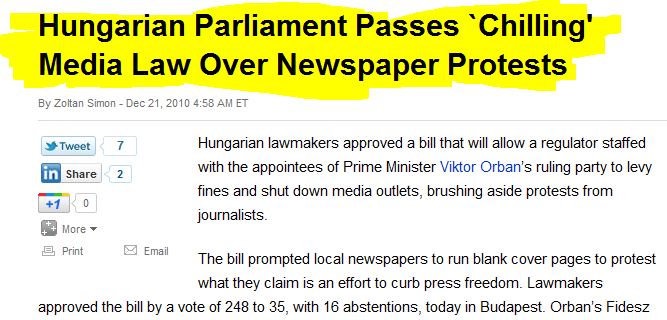 TV and radio stations can be fined for biased reporting under the “newly created Media Council” and reportedly, the new bill could require media outlets “to reveal their sources” and “the media authority can search editorial offices, copy reporters’ notes and mandate that publishers hand over confidential business information.” Any outlet that doesn’t comply could be fined, Bloomberg reported Budapest-daily Nepszabadsad reported.