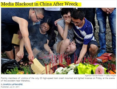 China’s Communist Party publicity department set up a “virtual news blackout” on a July 23 train crash, the New York Times reported.