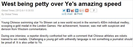 In question are claims that a Chinese record-breaking swimmer Ye Shiwen “may be using drugs,” which the Chinese media denied. The BBC noted that the British Olympic Association’s chairman “revealed that Ye had passed all drugs tests.”