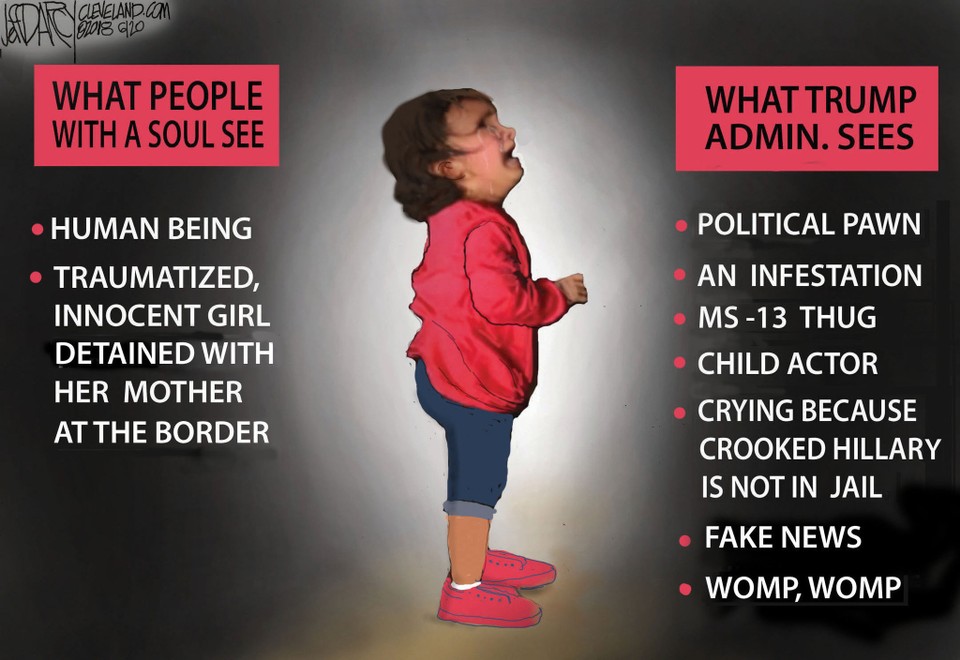 The cartoon shows the young girl in the middle of two text columns. The column on the left is headlined, “What people with a soul see,” and the column on the right reads, “What Trump admin. sees.”