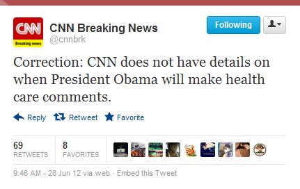 And, CNN Breaking News tweeted at 10:21 AM EST “Correction: The Supreme Court backs all parts of President Obama’s health care law. http://on.cnn.com/LvVRcK”