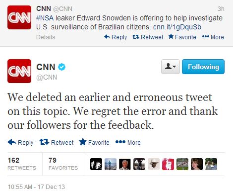 The original tweet read, according to Mediaite: “Edward Snowden offers to spy on the US & help Brazil investigate NSA surveillance cnn.it/1gDquSb”